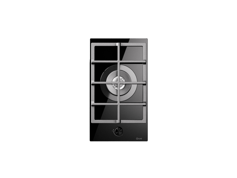 Gashäll för inbyggnad. Bottenplatta i svart härdat glas och med mattsvart Professional Plus vred.