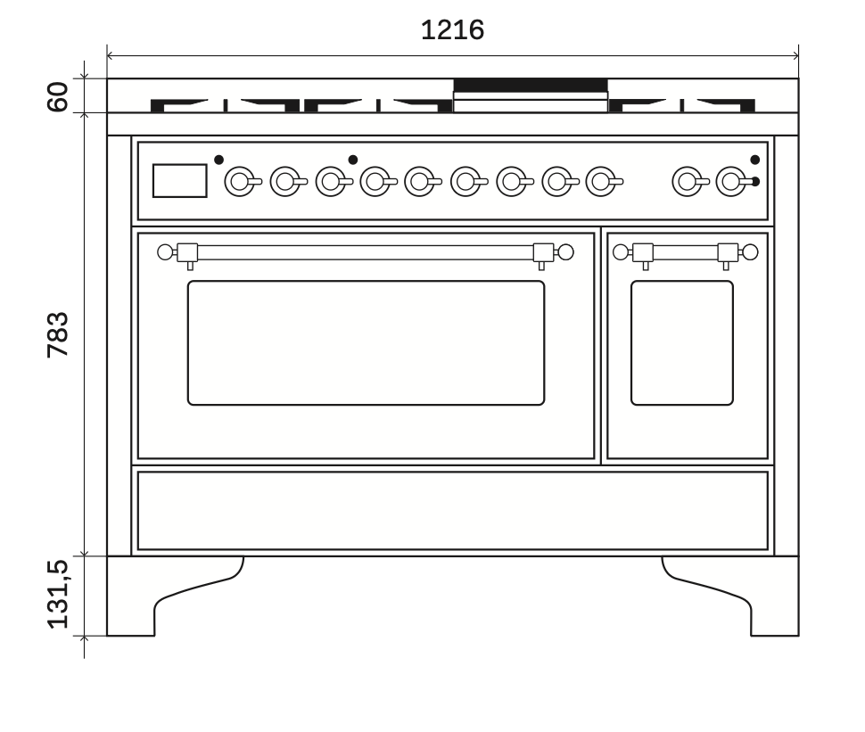 Måttskiss ILVE Majestic spis 120 med två ugnar, mått: bredd 1216 mm, höjd 914,5 mm, djup 700 mm.
